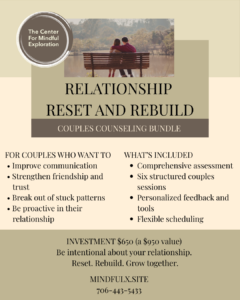 Relationship Reset and Rebuild is a structured six-session couples program grounded in the seven principles of healthy relationships developed by The Gottman Institute. It includes an assessment and guided sessions focused on communication, connection, and breaking out of stuck patterns. Perfect for couples who need a reset and for premarital counseling.